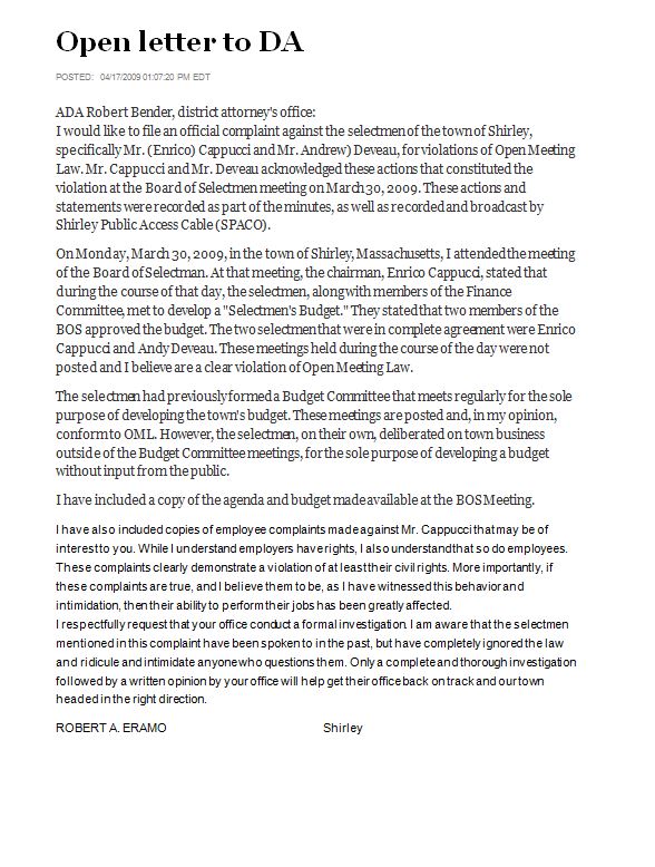 Statements of complaint have been posted 1st and then the minutes, finally an open letter to the DA concerning Cappucci!